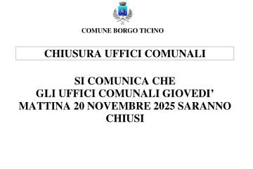 Si comunica che giovedì mattina 20 novembre 2025 gli uffici comunali saranno chiusi
