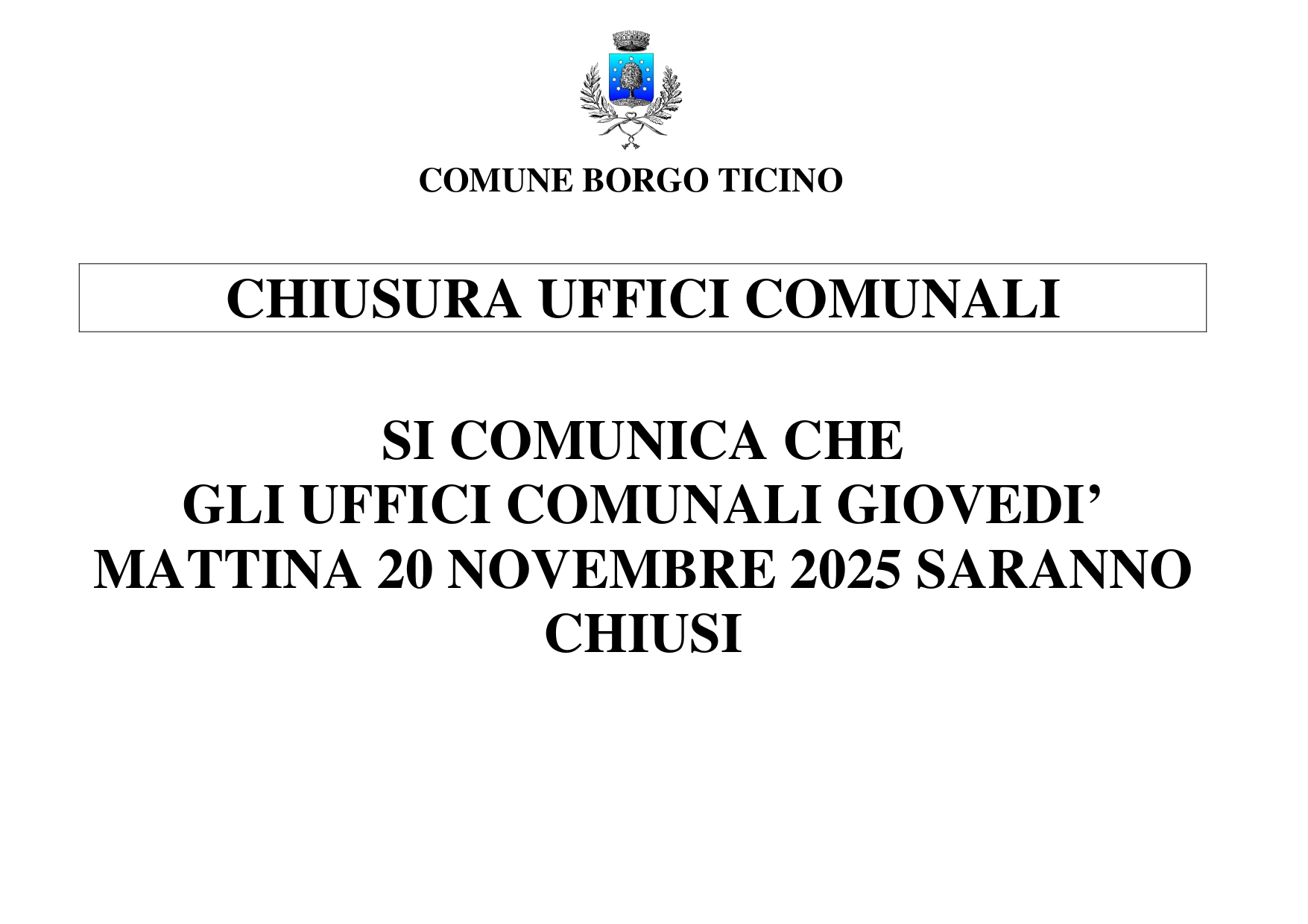Si comunica che giovedì mattina 20 novembre 2025 gli uffici comunali saranno chiusi
