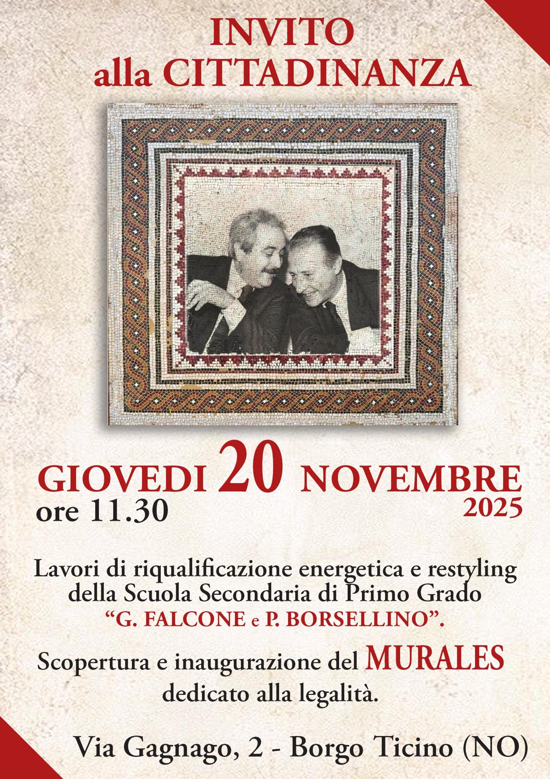 l'Amministrazione Comunale invita la cittadinanza a partecipare alla cerimonia di inaugurazione dei lavori di riqualificazione energetica e del nuovo murales dedicato ai valori della legalità e dell'impegno civile.
