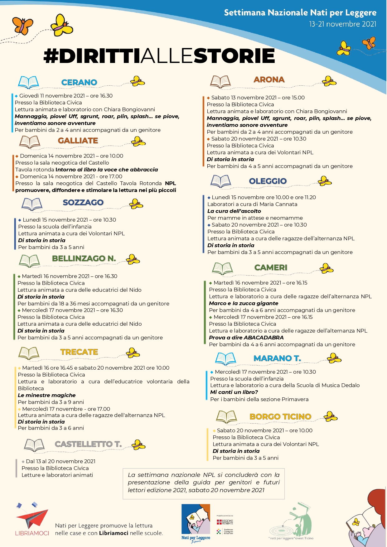Da oggi iniziano gli eventi dedicati alla “Settimana Nazionale Nati per Leggere” (13 - 20 novembre 2021). Anche il nostro Comune fa parte del Coordinamento NpL Piemonte Ovest Ticino e con grande entusiasmo abbiamo aderito all’iniziativa proposta: un calendario ricco di appuntamenti per tutelare e promuovere il diritto alle storie delle bambine e dei bambini.