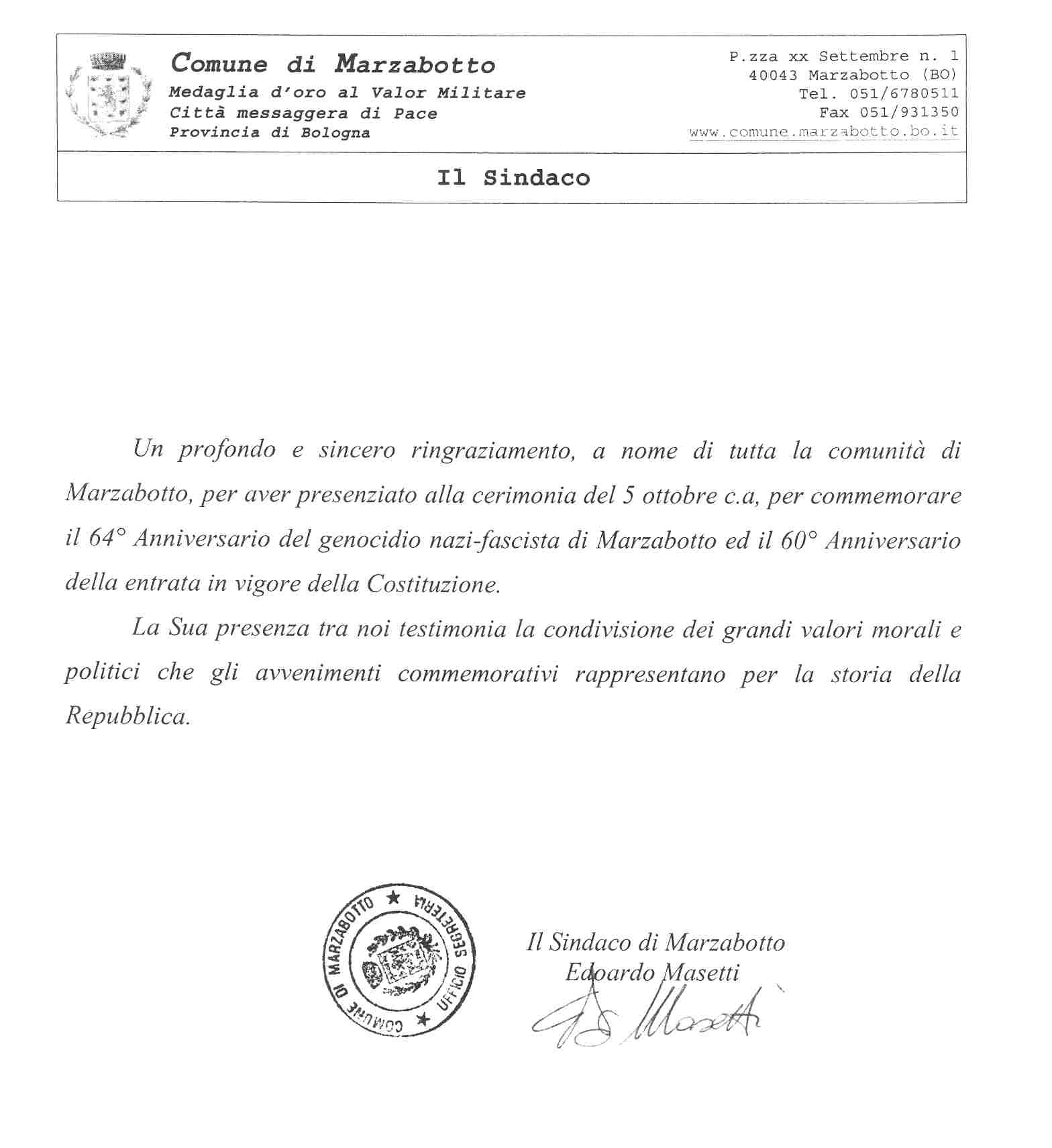 Domenica 5 ottobre, a Marzabotto è stato ricordato il 64° anniversario dell'eccidio del 1944, insieme al 60° anniversario della Costituzione italiana. Un numeroso gruppo di borgoticinesi e di sestesi, comprese le rappresentanze delle rispettive amministrazioni comunali (assessori Bellini e Buschini, consigliere Folino; presidente dell’Associazione combattenti e reduci Veneruso; assessore Pedretti di Sesto Calende), è stato presente alla commemorazione: la giornata è stata voluta come testimonianza di solidarietà, momento di ricordo e anche impegno a creare, attraverso la convivenza pacifica e civile, un'Italia che non debba più conoscere ingiustizie e stragi. E’ stata anche un’occasione per ricambiare numerosi la partecipazione dei rappresentanti del Comune di Marazabotto alla commemorazione dei martiri del 13 agosto.