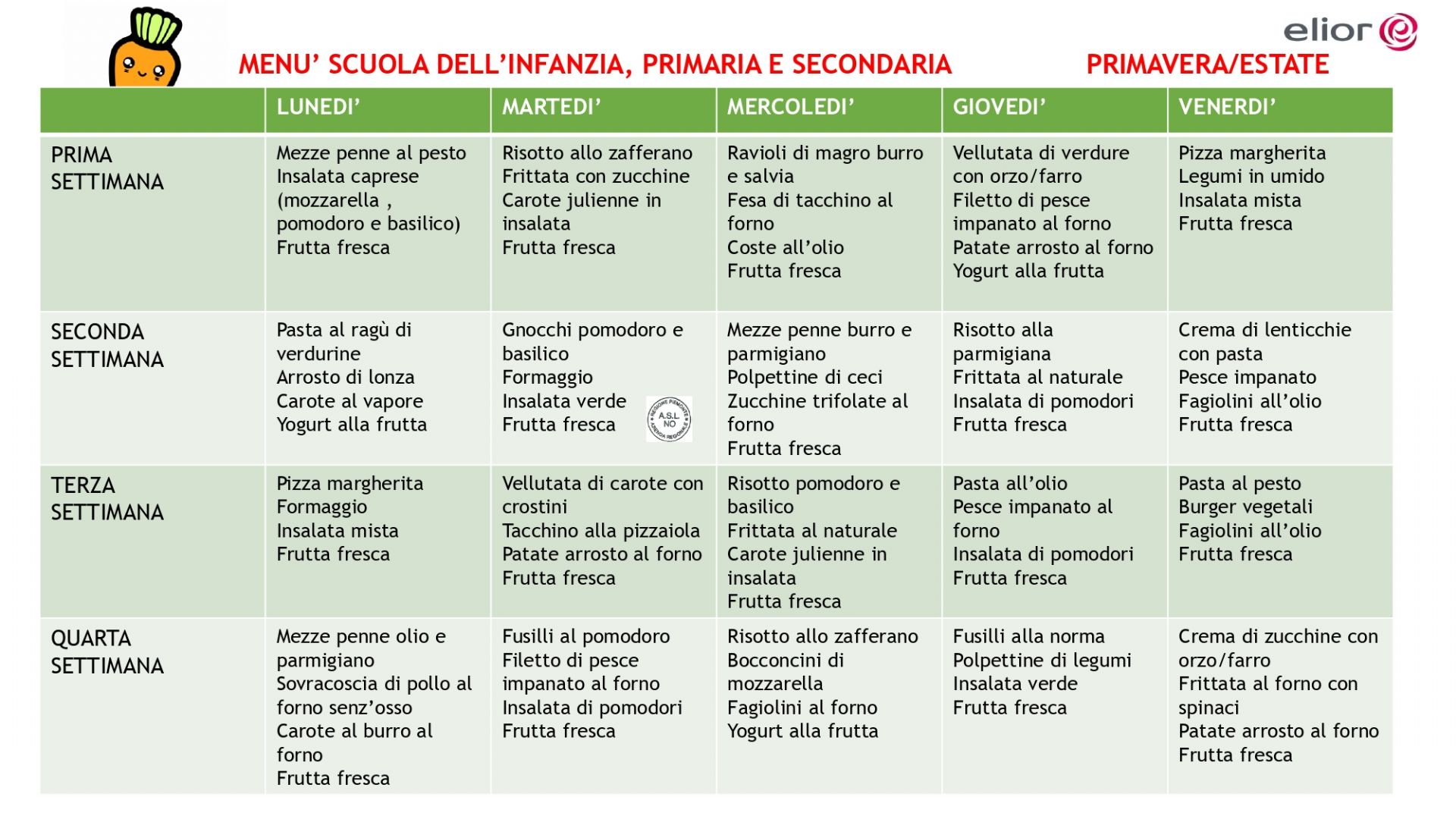 Menu' Ditta Elior - Primavera Estate a.s. 2025/2026