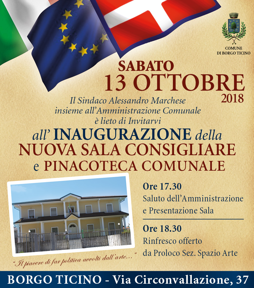 Il Sindaco con l'Amministrazione Comunale vi invita all'inaugurazione della nuova Sala Consiliare e Pinacoteca Comunale sabato 13 ottobre alle ore 17.30 in Via Circonvallazione, 37 Borgo Ticino.